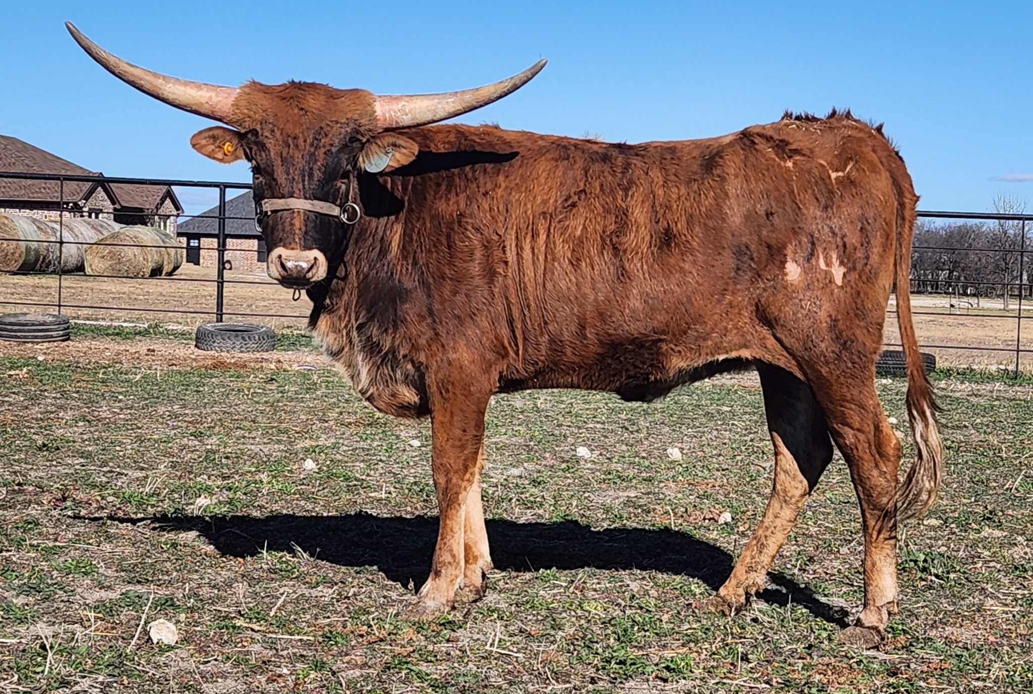 Top to bottom, this young heifer has twist genetics that will please even the most discerning eye and just look at that brindle coming in. She has the potential to be the most exciting heifer to come along in years. Her sire, M2 Rifleman, combined with her dam, Hubbells Fine Catch, bring together the most sought after, top money earning genetics in the industry today. Heifers with these genetics are bringing price tags north of $20,000, and at least one sold for over $70,000. If you are looking to add twist to your herd, look no further. Her horns are beginning their first flip over the top. This young heifer is a value adding explosion waiting to happen and maturity will only increase her value!